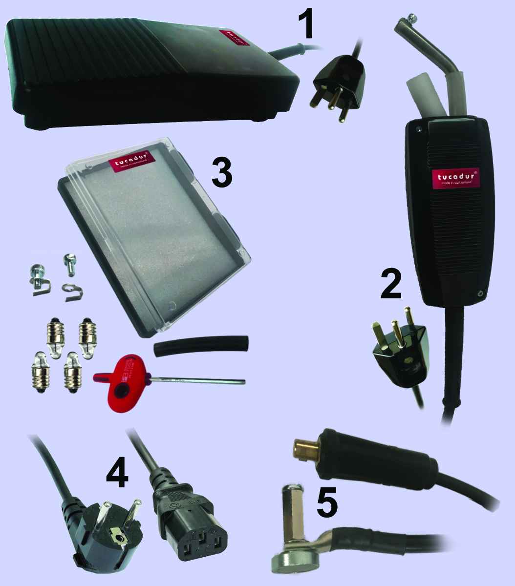 • Spare part box with: hexagon screwdriver, 4 bulbs, 1 tubular fitting tool, 2 clamping plates with screws, 24 assorted HM-electrodes,